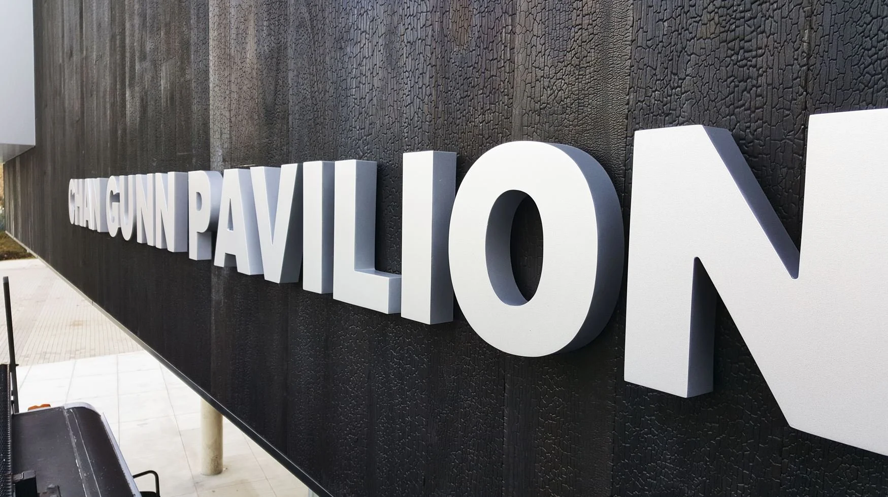 UBC Baseball Training Centre | Cedar Blanks Negative Space with Stainless Steel Letters Below